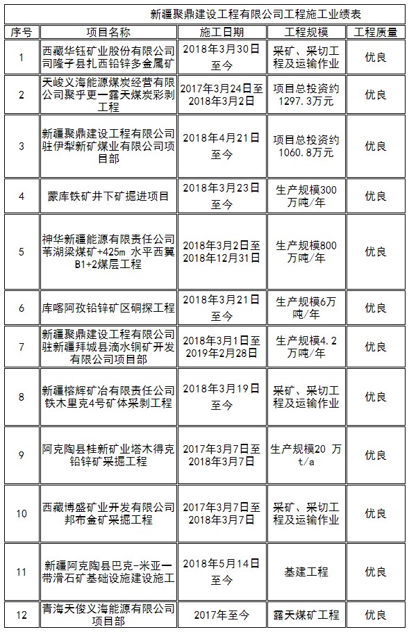 新疆聚鼎建設(shè)工程有限公司為國家礦山工程總承包二級企業(yè),創(chuàng)建于2013年,主要從事礦山采掘、隧道開挖、大型土石方爆破、機電設(shè)備安裝,水利水電工程,路橋工程等工程施工。